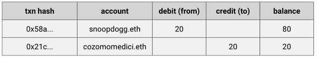 Here's how it shakes out: Snoop starts with 100 ETH and his account is debited 20 ETH. Cozomo starts with 0 ETH and his account is credited 20 ETH. Snoop's ending account balance is 80 ETH. Cozomo's is 20 ETH. Transfer complete.